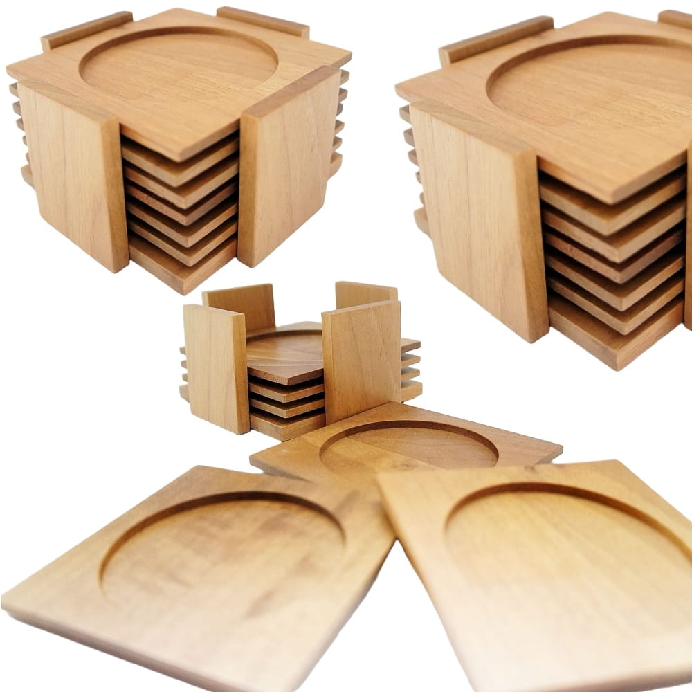 Opis: Stylowy komplet sześciu drewnianych podstawek pod szklanki, które pomagają zadbać o estetykę i higienę podczas posiłków. Podstawki są łatwe do czyszczenia, a dzięki wygodnemu stojakowi łatwo się je przechowuje.