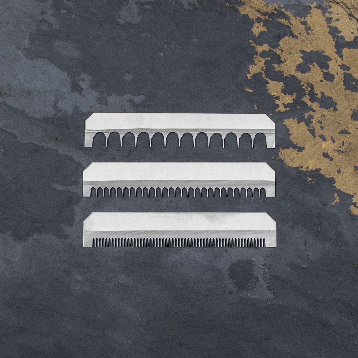 - Zestaw ostrzy: Trzy wymienne ostrza o rozstawie ząbków 1 mm, 3 mm, 7 mm, oraz jedno o krawędzi prostej.