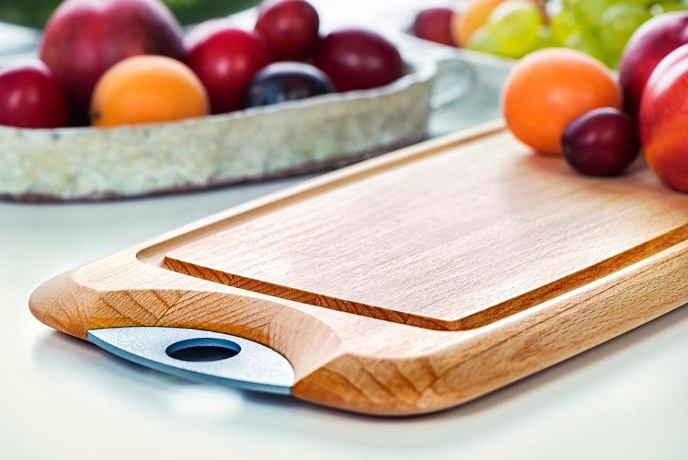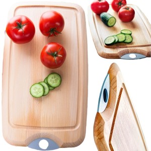 Opis: Poręczna deska do krojenia z jasnego, litego drewna, wyposażona w praktyczny uchwyt i estetycznie wykończona fazowanym obrzeżem. Jest łatwa w konserwacji, nie tępi noży i nadaje wnętrzom ciepły, pogodny charakter.