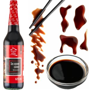 Opis: Sos sojowy ciemny bez glutaminianu sodu w butelce o pojemności 625ml firmy House of Asia. Aromatyczny ciemny sos sojowy, produkowany w procesie naturalnej fermentacji, który nadaje potrawom głębię smaku, intensywny aromat i charakterystyczny, ciemny kolor. Idealny do dań kuchni azjatyckiej oraz marynat.