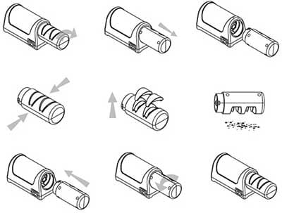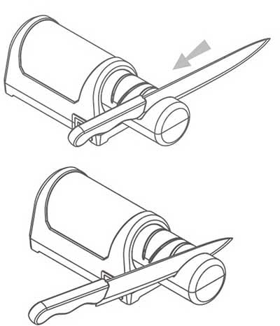 Stopień 1 - Użyj tego stopnia tylko wtedy gdy nóż jest naprawdę tępy, lub gdy chcesz naostrzyć nóż ceramiczny. By naostrzyć nóż, przesuń go (lekko dociskając) kilkukrotnie najpierw przez jedną, potem przez drugą szczelinę.
