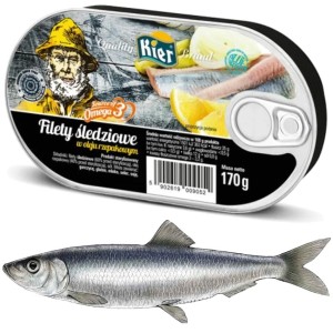 Opis: Filety śledziowe w oleju rzepakowym w opakowaniu o pojemności 170g, wyprodukowane przez firmę Kier.