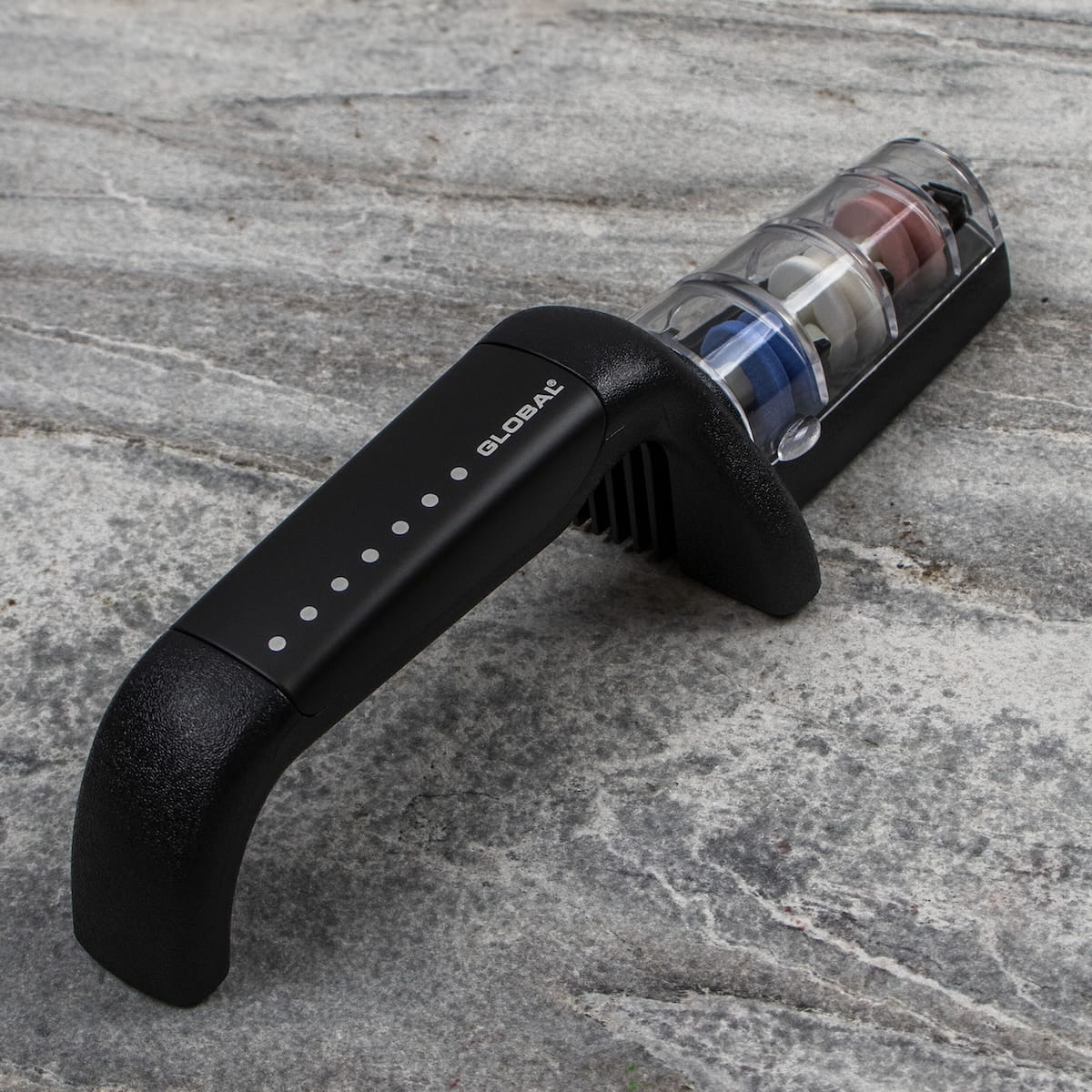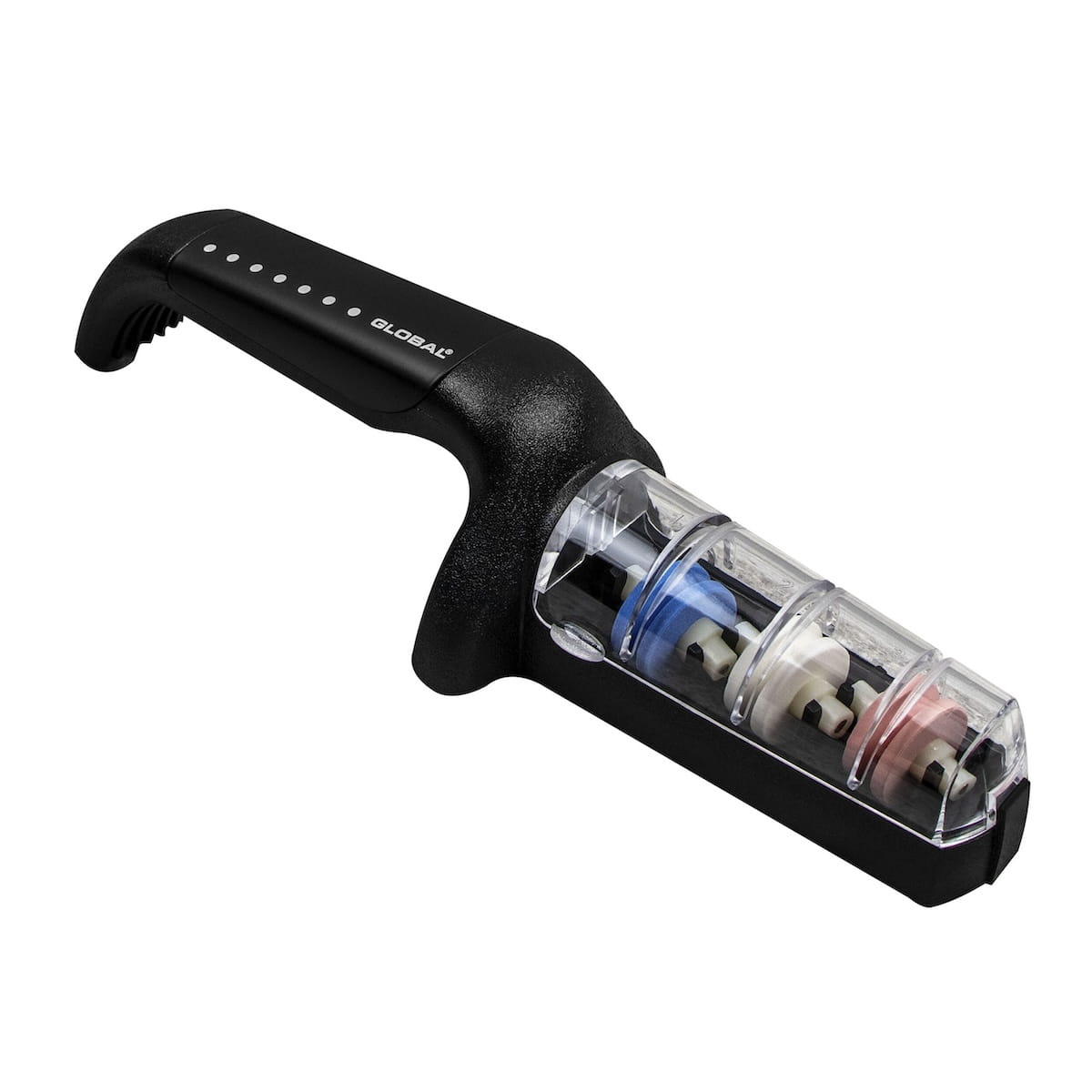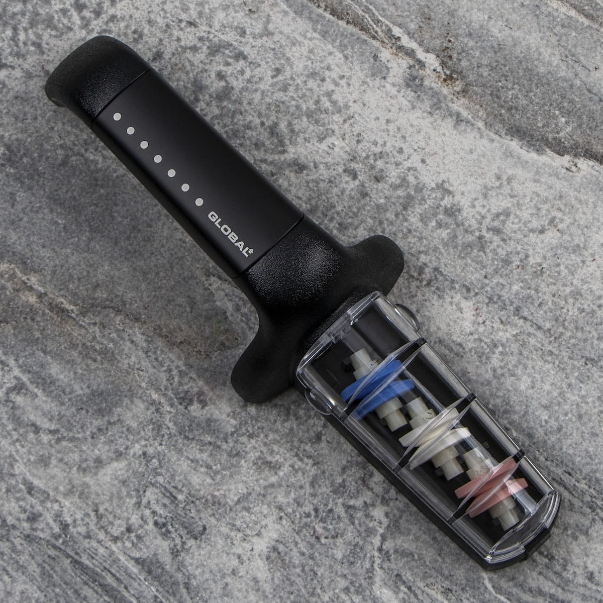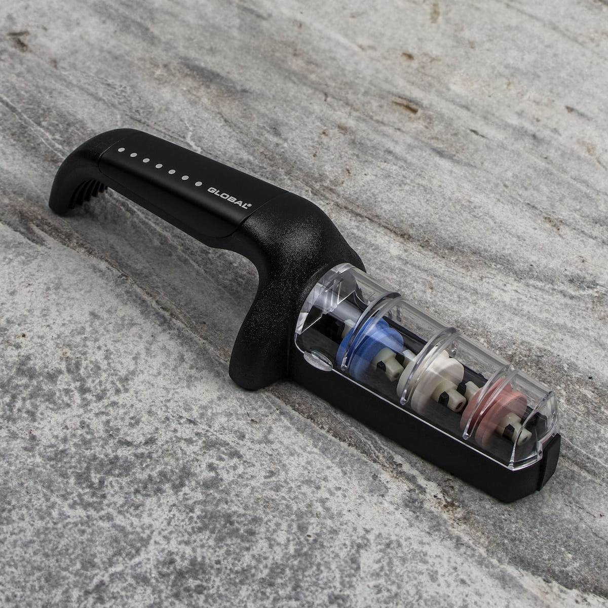 Opis: Trzyfazowa ostrzałka ceramiczna, zaprojektowana specjalnie dla noży Global i przeznaczona do ostrzenia wszystkich rodzajów noży, z wyjątkiem tych o szlifach jednostronnych, np. tradycyjnych noży japońskich. Dzięki wodzie proces ostrzenia przebiega szybciej, a fabrycznie ustawione otwory ułatwiają naostrzenie noża pod odpowiednim kątem. Gumowany uchwyt i podstawa mają właściwości przeciwpoślizgowe.