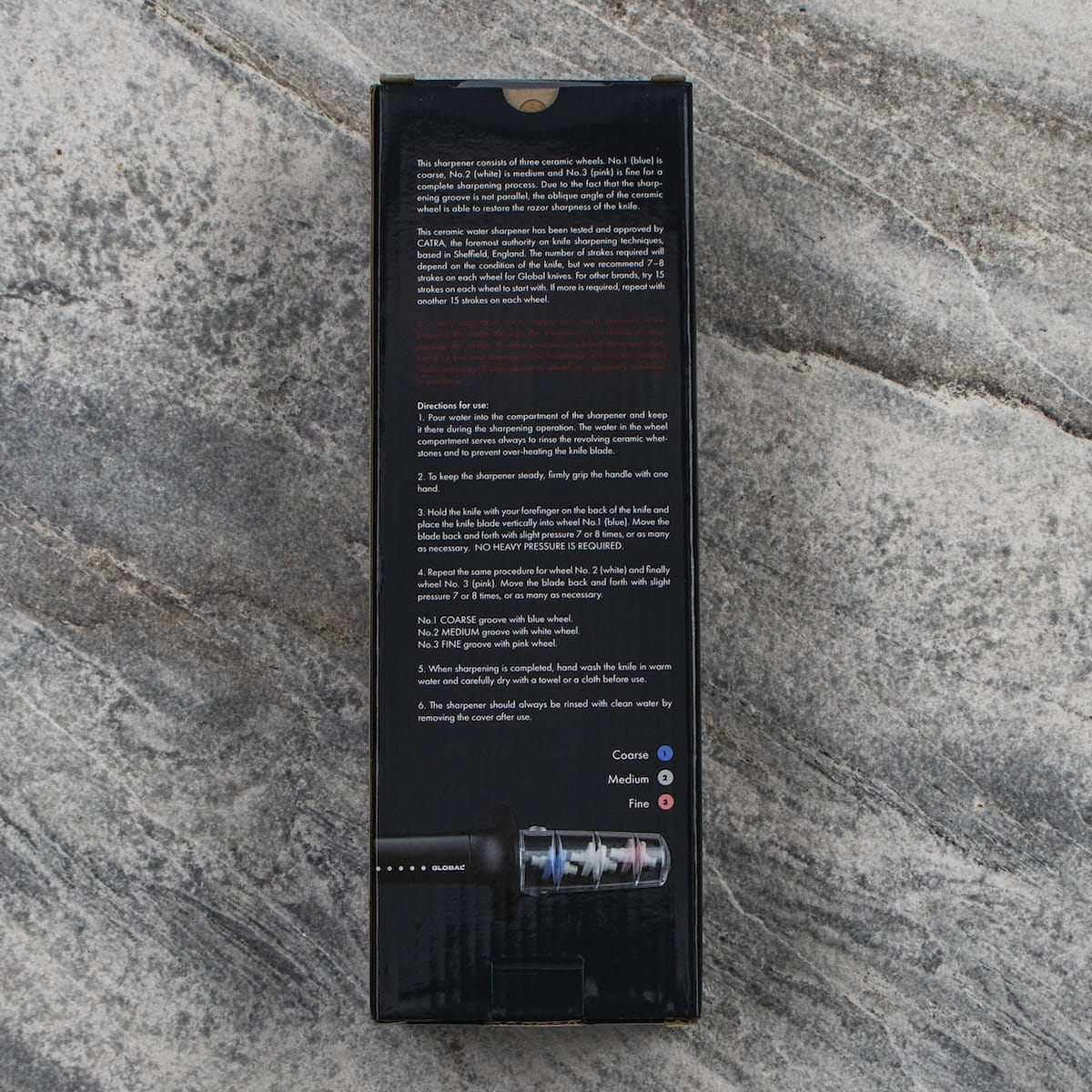 Kwestia, ile razy należy przesuwać ostrzoną krawędź, zależy od typu i kondycji noża. W przypadku noży Global zaleca się po 7-8 razy w każdym kole. Noże innych marek można przesunąć po 15 razy w każdym kole, a jeśli nóż nie jest wystarczająco ostry, powtórzyć czynność po 15 razy.