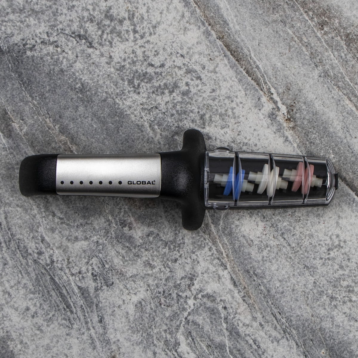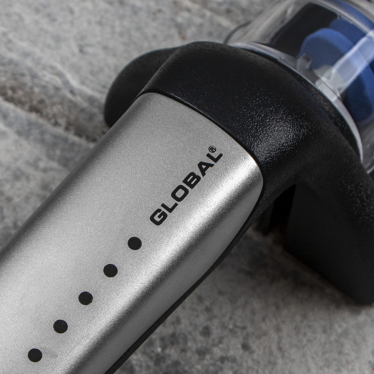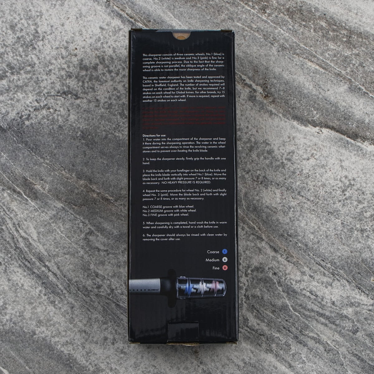 Opis: Trzyfazowa ostrzałka ceramiczna, zaprojektowana specjalnie dla noży Global i przeznaczona do ostrzenia wszystkich rodzajów noży, z wyjątkiem tych o szlifach jednostronnych, np. tradycyjnych noży japońskich. Dzięki wodzie proces ostrzenia przebiega szybciej, a fabrycznie ustawione otwory ułatwiają naostrzenie noża pod odpowiednim kątem. Gumowany uchwyt i podstawa mają właściwości przeciwpoślizgowe.