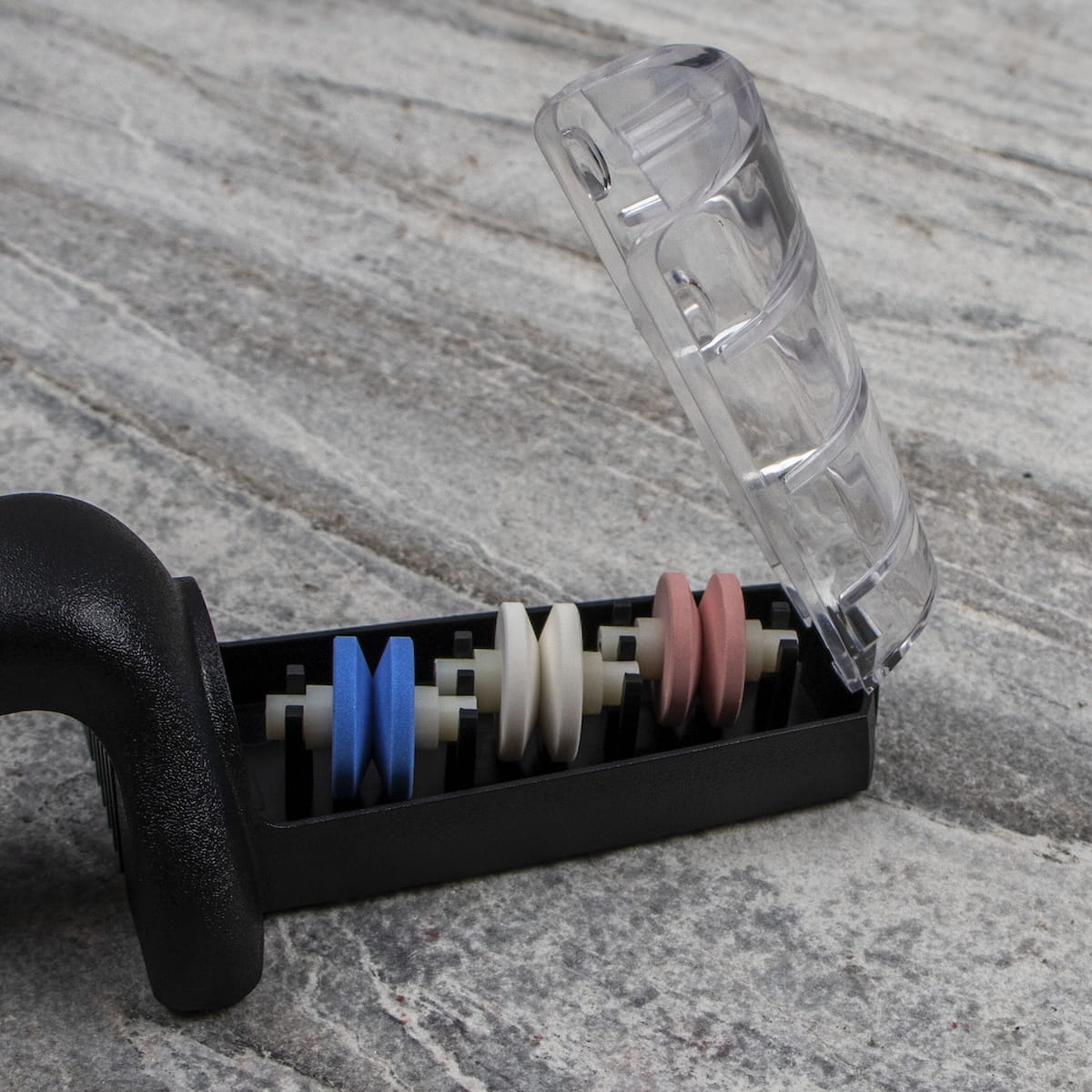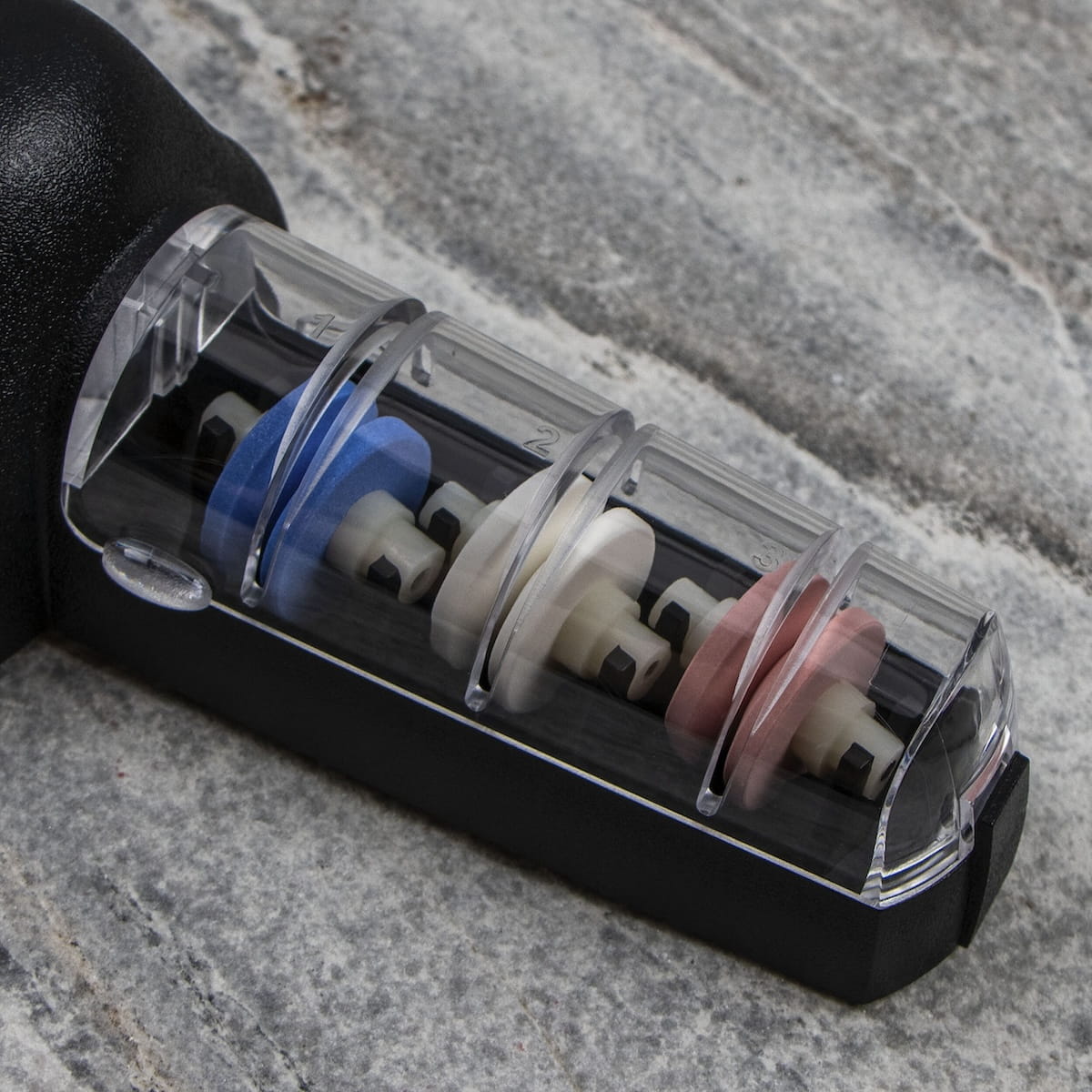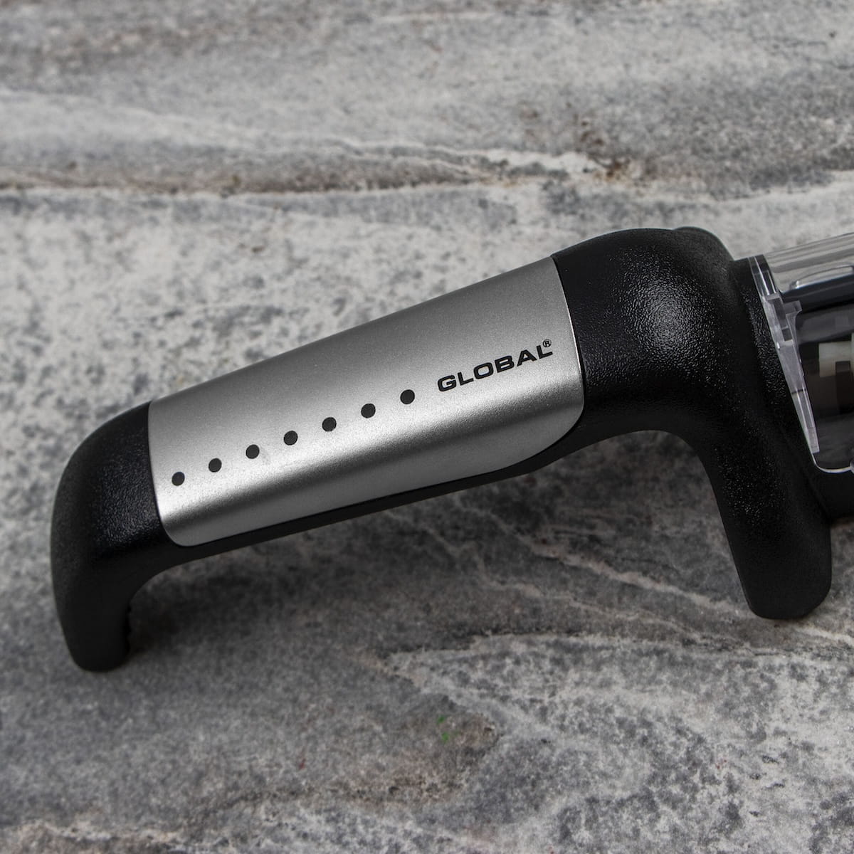 Opis: Trzyfazowa ostrzałka ceramiczna, zaprojektowana specjalnie dla noży Global i przeznaczona do ostrzenia wszystkich rodzajów noży, z wyjątkiem tych o szlifach jednostronnych, np. tradycyjnych noży japońskich. Dzięki wodzie proces ostrzenia przebiega szybciej, a fabrycznie ustawione otwory ułatwiają naostrzenie noża pod odpowiednim kątem. Gumowany uchwyt i podstawa mają właściwości przeciwpoślizgowe.