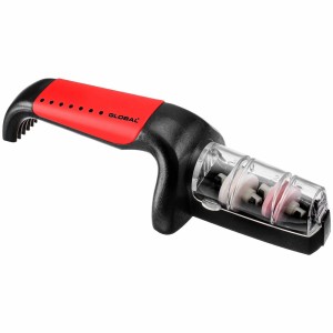 Opis: Dwufazowa ostrzałka ceramiczna, zaprojektowana specjalnie dla noży Global i przeznaczona do ostrzenia wszystkich rodzajów noży, z wyjątkiem tych o szlifach jednostronnych, np. tradycyjnych noży japońskich. Dzięki wodzie proces ostrzenia przebiega szybciej, a fabrycznie ustawione otwory ułatwiają naostrzenie noża pod odpowiednim kątem. Gumowany uchwyt i podstawa mają właściwości przeciwpoślizgowe.