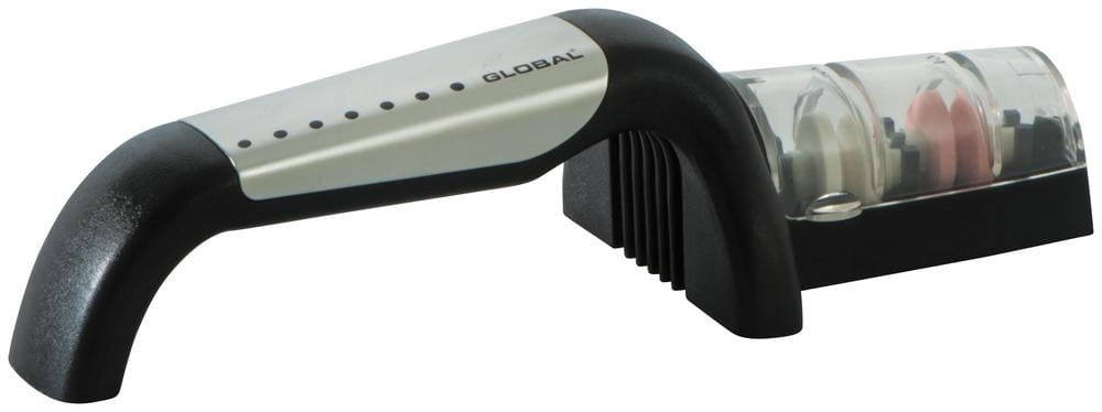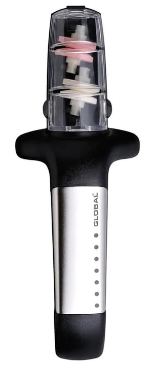 Opis: Dwufazowa ostrzałka ceramiczna, zaprojektowana specjalnie dla noży Global i przeznaczona do ostrzenia wszystkich rodzajów noży, z wyjątkiem tych o szlifach jednostronnych, np. tradycyjnych noży japońskich. Dzięki wodzie proces ostrzenia przebiega szybciej, a fabrycznie ustawione otwory ułatwiają naostrzenie noża pod odpowiednim kątem. Gumowany uchwyt i podstawa mają właściwości przeciwpoślizgowe.