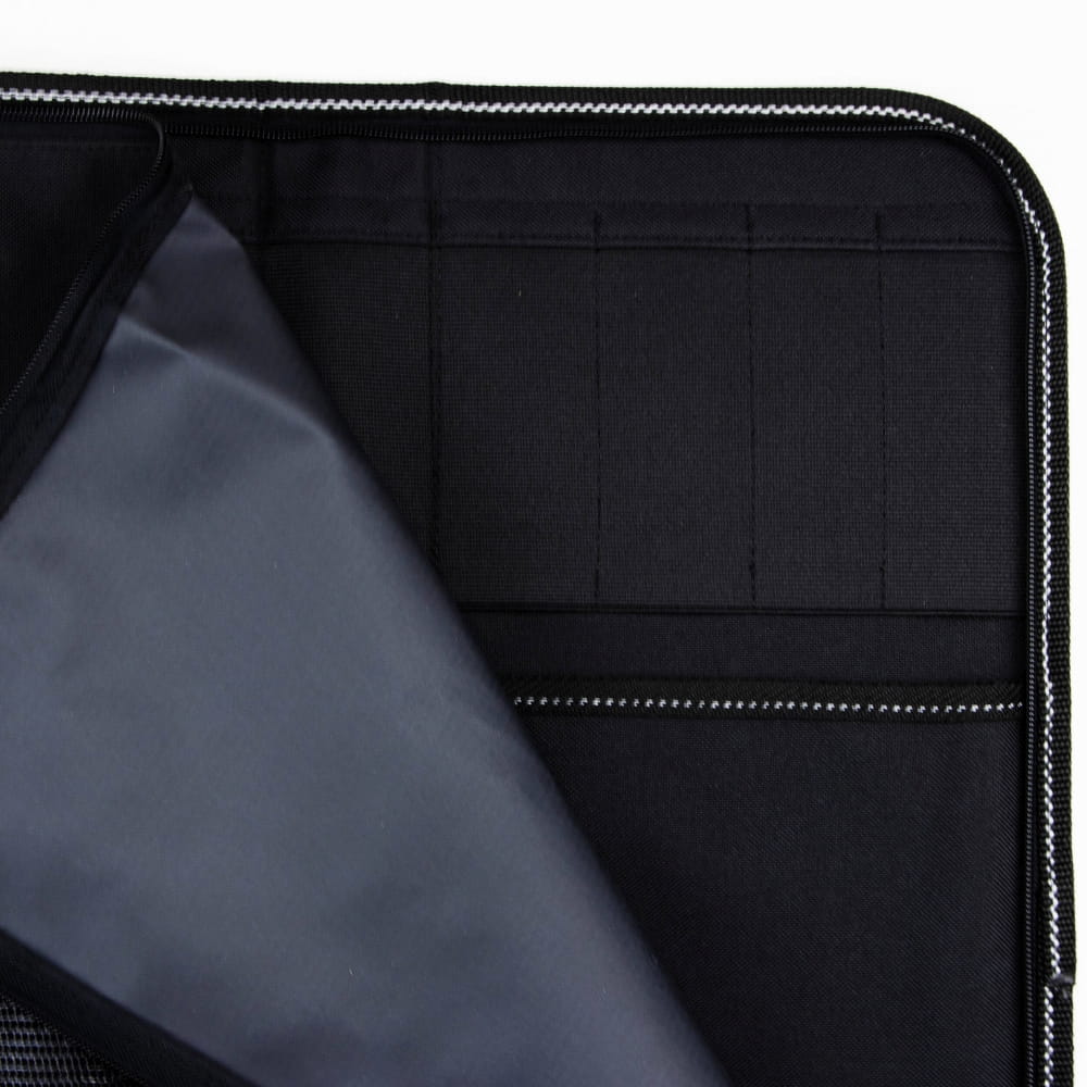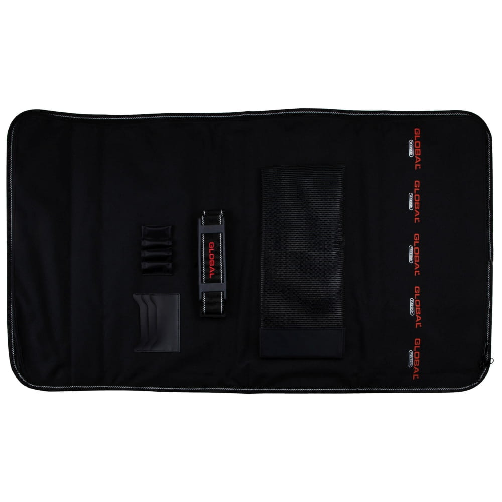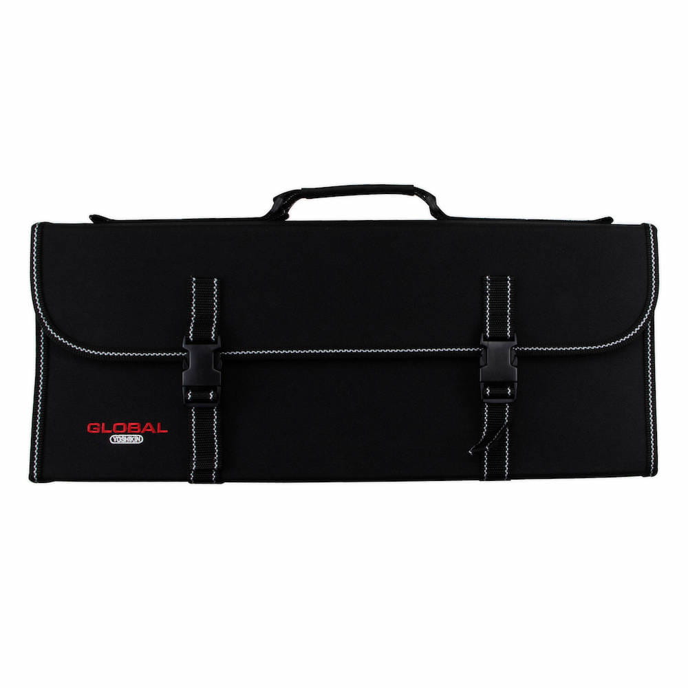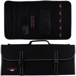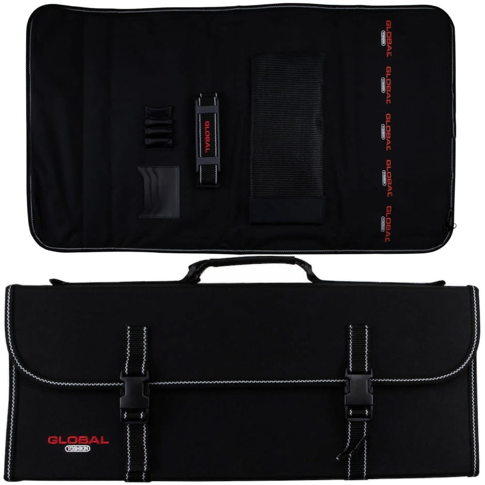 Opis: Usztywniona, składana torba z solidnego nylonu, w której można bezpiecznie przewozić i przechowywać noże Global. Wyposażono ją w wygodną rączkę i doczepiany pasek. Torba jest zapinana na klamry i posiada szesnaście kieszeni na różnej wielkości noże oraz przestrzeń na dodatkowe akcesoria. Komora z nożami zapinana jest w całości na zamek błyskawiczny.