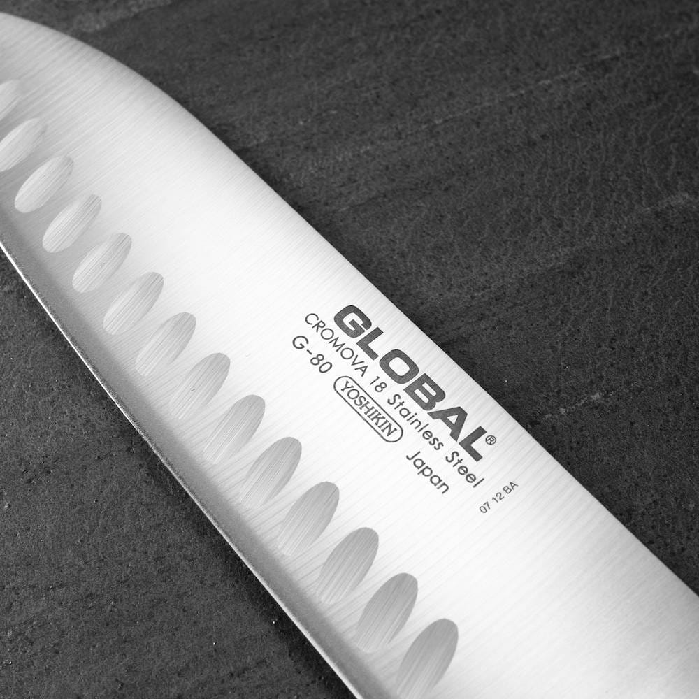 Global Japoński Nóż Kuchenny Santoku Żłobiony Do Warzyw 56-58 HRC 18cm G-80