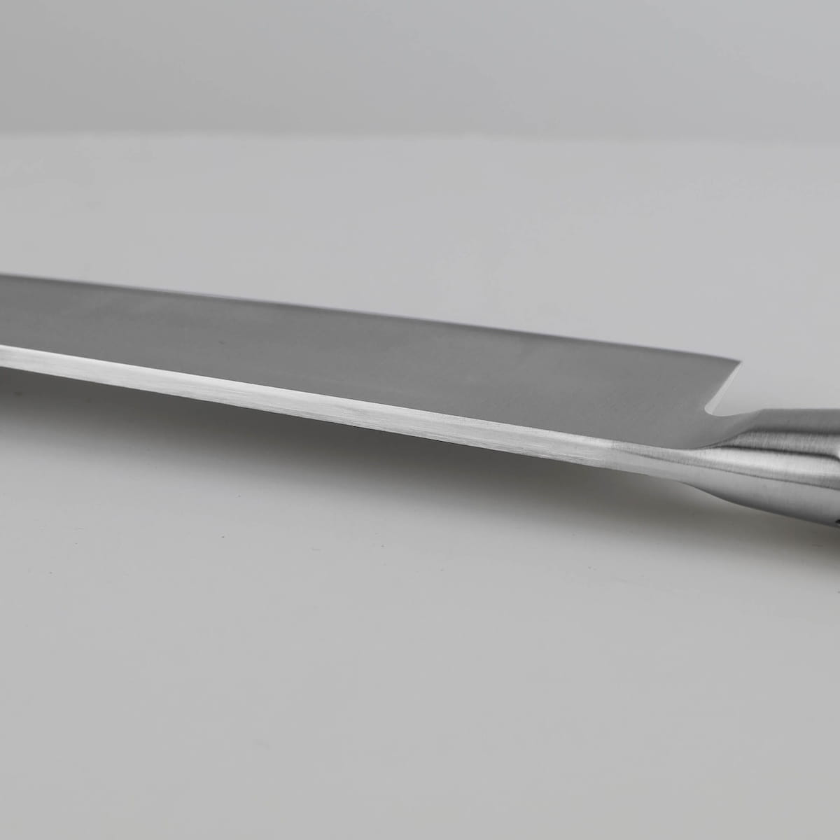 Opis: Najbardziej wszechstronny nóż kuchenny, przeznaczony do cięcia, krojenia, szatkowania i plastrowania rozmaitych produktów. Jest wystarczająco długi, aby można było nim kroić nawet naprawdę duże płaszczyzny, i odpowiednio wyprofilowany, aby swobodnie przesuwać klingę w obydwu kierunkach.
