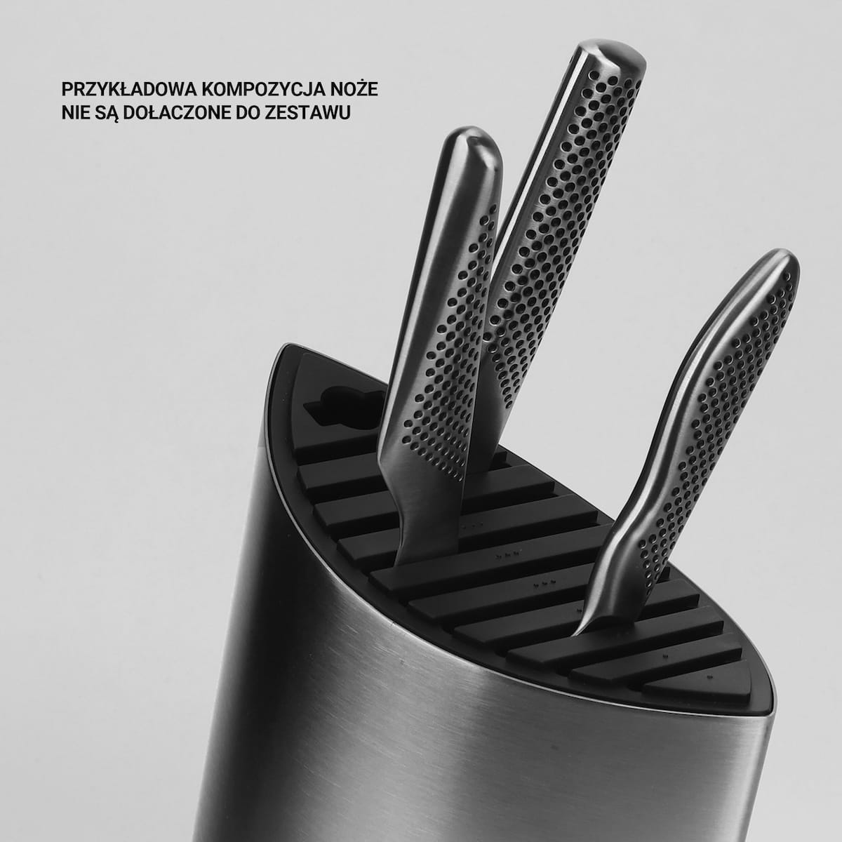 Średniej wielkości blok z dziesięcioma otworami na 9 noży o różnej szerokości (nie dłuższych niż 24cm) oraz specjalnym otworem na parę nożyczek kuchennych lub pręt ostrzący. Urzekający projekt autorstwa Komina Yamady przypomina kształt żaglowca pod pełnymi żaglami. Srebrny kadłub ozdobiono czarnymi kropkami i wyposażono w czarną, przeciwpoślizgową podstawę, którą można zdjąć. Dzięki takiemu rozwiązaniu znika problem czyszczenia otworów, co ułatwia przestrzeganie nawet najwyższych standardów higieny. Ten piękny, funkcjonalny blok pozwoli bezpiecznie przechowywać cenne noże i utrzymywać je w nieskazitelnym stanie.