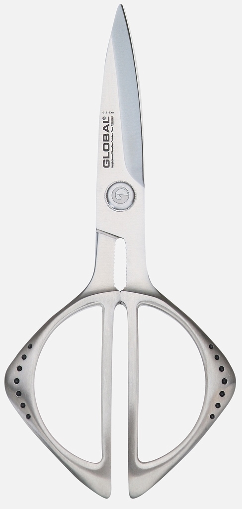 Opis: Ekstremalnie ostre, uniwersalne nożyce kuchenne o nowoczesnym, ergonomicznym kształcie, który wpisuje się w estetykę linii noży Global. Wykonane z niezwykłą starannością i z wysokiej jakości materiału, nożyce zostały zaprojektowane w taki sposób, aby komfortowo leżały w dłoni, a siła nacisku była jak największa. Ostrza wyposażono w mikroząbki, które zapobiegają wyślizgiwaniu się produktów.