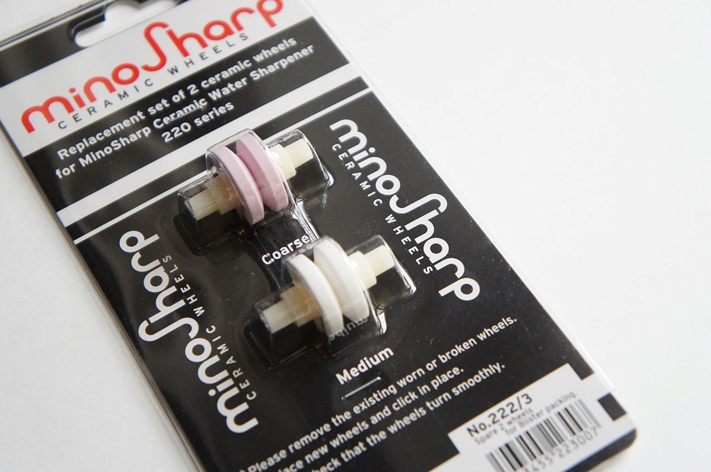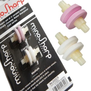 Opis: Dwa zapasowe kamienie ostrzące przeznaczone dla ceramicznych ostrzałek wodnych MinoSharp do noży Global z serii 220. W zestawie znajduje się jedno koło białe (grube ziarno) i jedno koło różowe (średnie ziarno).