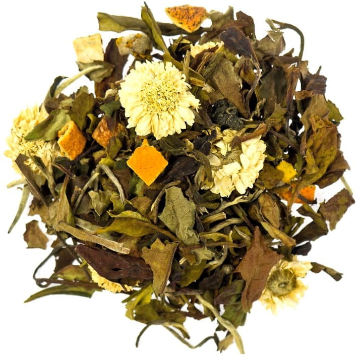 Składniki: Herbata biała Shou Mei (Długowieczne Brwi), herbata biała Pai Mu Tan (Biała Piwonia), herbata biała Snow Buds (Białe Paczki), herbata zielona China Bancha, kokos, skórka pomarańczy, rzymski rumianek, goździki, cynamon.
