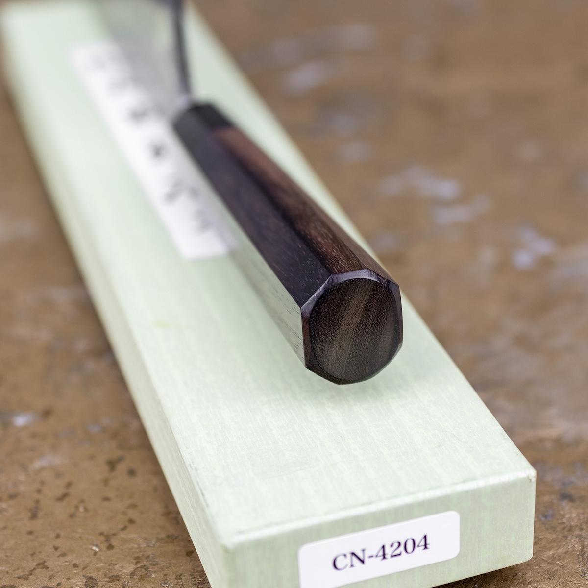 Oktagonalna rękojeść z drewna różanego, zakończona pierścieniem z drewna pakka, zapewnia pewny chwyt i doskonałe wyważenie nawet podczas długiej, intensywnej pracy. Klasyczna forma rękojeści podkreśla tradycyjny charakter japońskiego rzemiosła i komfort użytkowania.