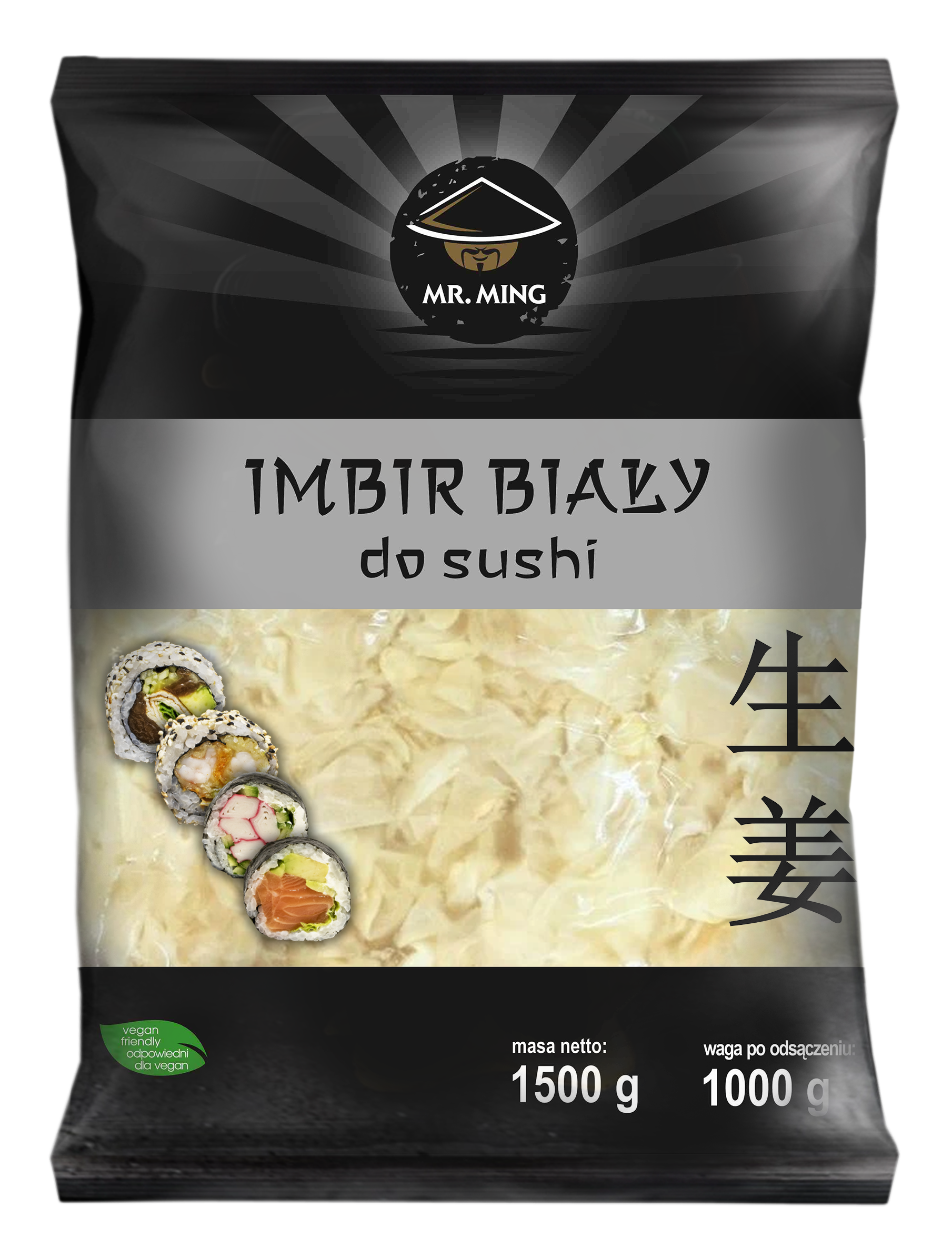 Opis: Imbir do sushi naturalny marynowany biały w dużym opakowaniu 1,5kg firmy Mr.Ming. Wysokiej jakości biały imbir marynowany do sushi, wyróżniający się delikatnym aromatem oraz lekko pikantnym smakiem. Cienkie plasterki naturalnego imbiru doskonale komponują się z sushi, sashimi oraz daniami z ryżu, podkreślając ich smak i świeżość. Spożywany pomiędzy kolejnymi kęsami pomaga skutecznie oczyszczać kubki smakowe, poprawiając odbiór kolejnych potraw.