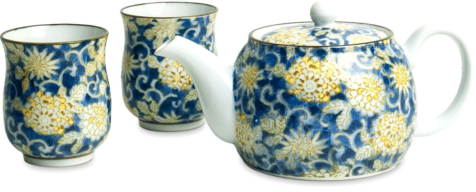 Japoński Elegancki Zestaw Do Herbaty Niebiesko Żółty Kwiatowy Wzór EMRO AZIATICA