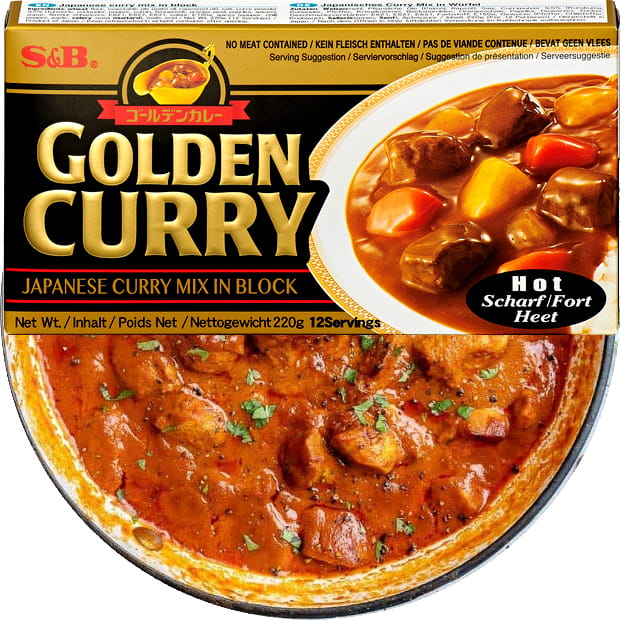 Sposób przygotowania: Zagotuj w rondlu wodę. Dodaj pokrojone w kostkę warzywa, takie jak marchewka i ziemniaki, a także ulubione mięso. Do gotujących się składników dodaj kostkę S&B Golden Curry, jedną na osobę. Starannie wymieszaj i gotuj na małym ogniu, aż warzywa staną się miękkie. Podawaj z ryżem.