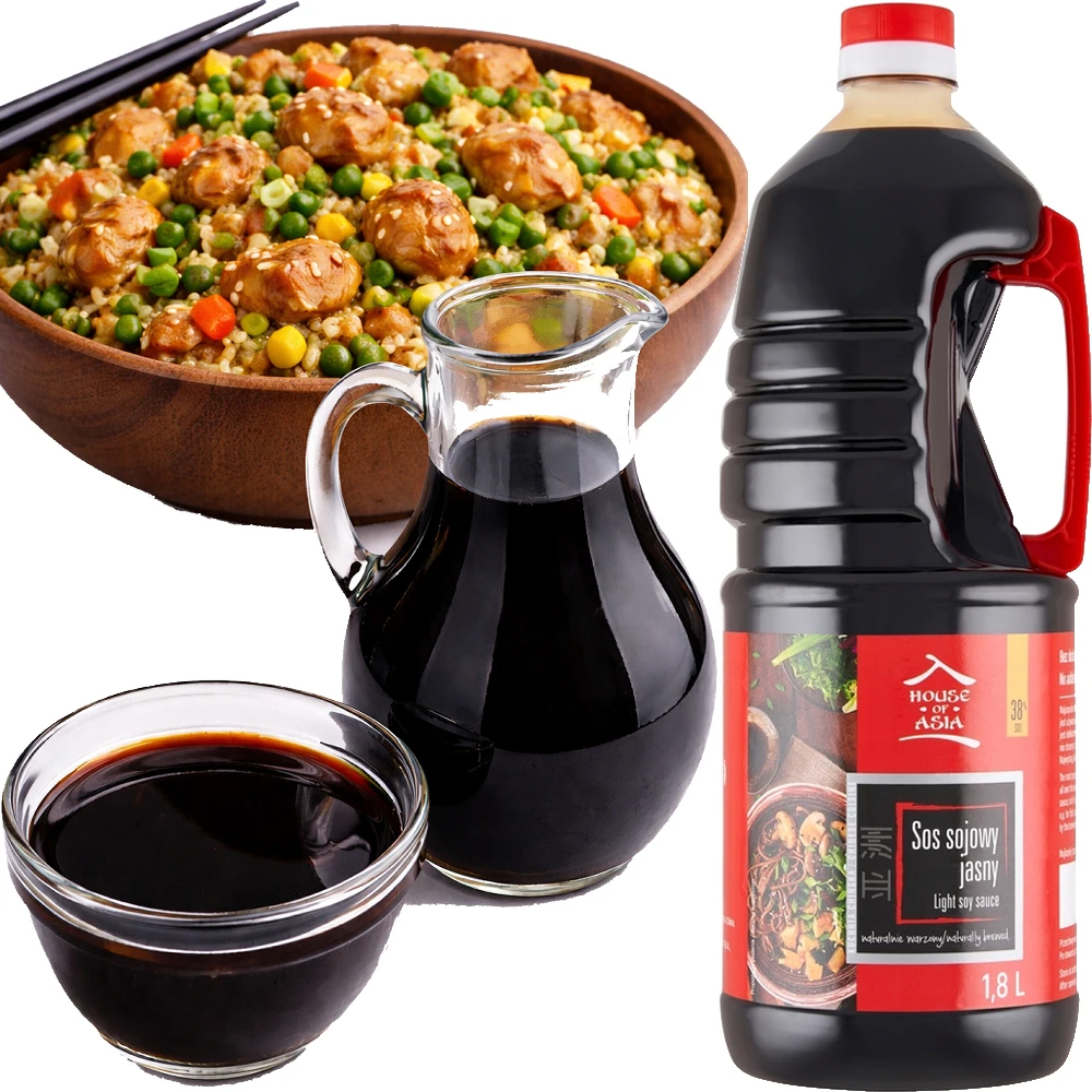 Opis: Sos sojowy jasny bez glutaminianu sodu w butelce o pojemności 1,8 Litra 1800ml firmy House of Asia. Wysokiej jakości jasny sos sojowy, przygotowany metodą naturalnego warzenia, ceniony za delikatny smak i szerokie zastosowanie w kuchni. Doskonale sprawdza się jako dodatek do sushi, ryżu, makaronu, warzyw oraz jako baza do sosów, marynat i dań typu stir-fry. Brak dodatku glutaminianu sodu (MSG) pozwala zachować czysty, naturalny profil smakowy i autentyczny charakter produktu.