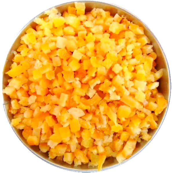 Kawałki naturalnej skórki pomarańczowej kandyzowanej w słodkim syropie, idealne do wypieków, deserów i dekoracji potraw.