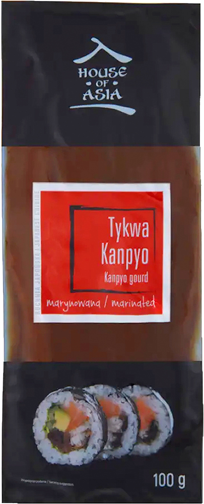 Opis: Kanpyo tykwa do sushi w opakowaniu 100g firmy House of Asia. Popularny składnik roladek sushi o karmelowym smaku. Tradycyjny japoński składnik sushi, przygotowany z marynowanej tykwy (kanpyo) o delikatnie karmelowym, słodkawym aromacie. Gotowa do użycia, świetnie uzupełnia rolki sushi, hosomaki i inne dania kuchni japońskiej.