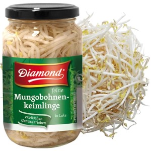 Opis: Kiełki fasoli mung w wygodnym do użycia słoiku o pojemności 330ml firmy Diamond. Kiełki fasoli mung często nazywane również kiełkami sojowymi. To jeden z popularniejszych dodatków warzywnych do dań kuchni azjatyckiej. W swoim składzie posiadają bardzo dużo wartości odżywczych oraz witamin. Są chrupkie i delikatne w smaku.