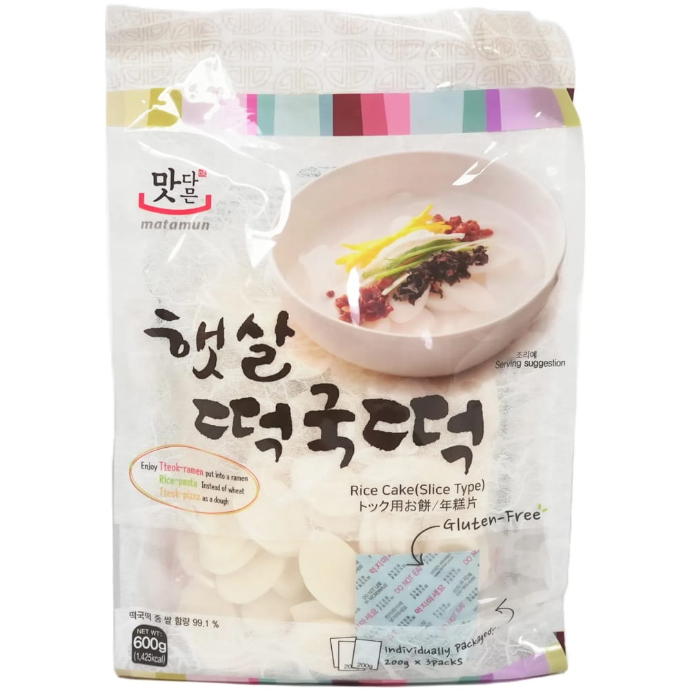 Opis: Kluski ryżowe koreańskie tteokguk w opakowaniu 600g (3x200g) w formie plasterków, firmy MATAMUN. Wyrabiane z ciasta tteok, które powstaje z kleistego krótkoziarnistego ryżu najwyższej jakości. Kluski ryżowe to jeden z podstawowych składników kuchni koreańskiej – są szeroko wykorzystywane w tradycyjnych potrawach i cenione za swoją charakterystyczną konsystencję.