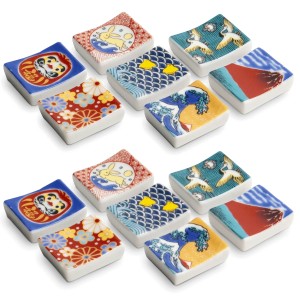 Opis: Bardzo ładna estetyczna kolorowa prostokątna podstawka na pałeczki z różnymi orientalnymi wzorami. Podstawka ma rozmiar około 3,5cm x 4,0cm i wysokości około 1cm. UWAGA ! Kupując jeden produkt otrzymasz 1 sztukę. Zdjęcie obrazuje 7 różnych podstawek z różnymi wzorami, które wysyłamy losowo.