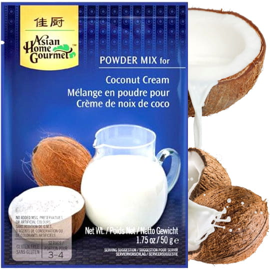 Opis: Krem kokosowy w proszku w saszetce o pojemności 50g firmy Asian Home Gourmet. Używane na wiele sposób, do łagodzenia ostrych potraw, jak i nadawania im kokosowego smaku i aromatu. Wspaniale nadaje się również do kawy i deserów. Bardzo wygodne w stosowaniu, aby otrzymać mleko kokosowe wystarczy wymieszać 150ml letniej wody z 2-3 łyżkami stołowymi mleka kokosowego w proszku.