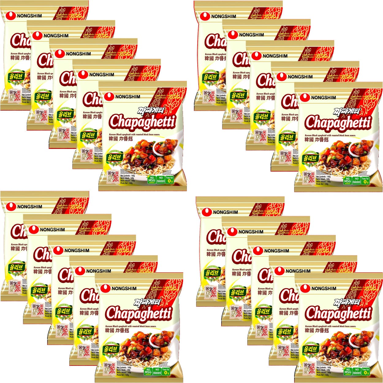 Zestaw dwudziestu porcji popularnego w Korei makaronu w stylu jajangmyeon. Charakteryzuje się sprężystym, pszennym makaronem oraz sosem na bazie pasty z czarnej fasoli, który nadaje mu głęboki, lekko słodkawy i jednocześnie wyrazisty smak. Chapagetti to jedna z najbardziej znanych propozycji marki Nongshim, często wybierana jako szybka alternatywa dla tradycyjnego dania.