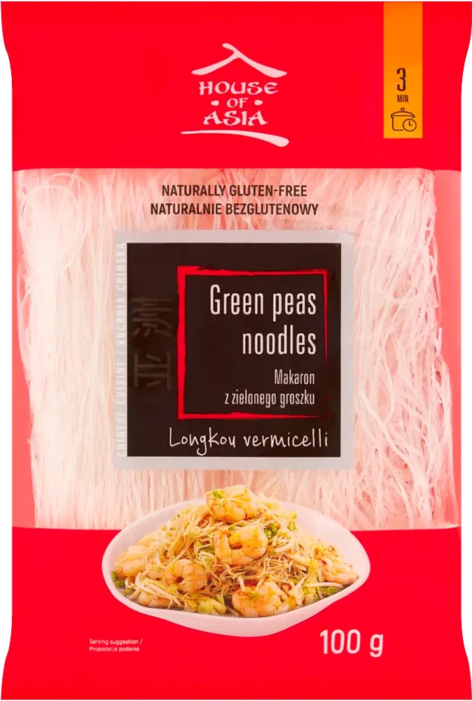 Opis: Makaron z zielonego groszku nazywany również sojowym w opakowaniu 100g w formie nitek vermicelli glass noodles firmy HOUSE OF ASIA. Delikatny makaron vermicelli, ceniony w kuchni azjatyckiej za swoją lekką i sprężystą strukturę. Cienkie, przeźroczyste nitki po przygotowaniu stają się elastyczne i doskonale chłoną smak sosów, przypraw oraz dodatków. Produkt idealnie sprawdza się w zupach, stir-fry, sałatkach oraz daniach z warzywami, mięsem i owocami morza.