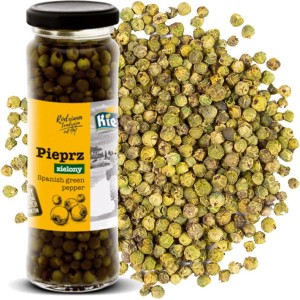 Opis: Marynowany zielony pieprz w postaci ziarnistej w zalewie w słoiczku o pojemności 110g. Pochodzi z Hiszpanii i został wyprodukowany przez Polską firmę KIER. Pieprz swój ostry smak zawdzięcza związkowi piperynie, który gromadzi się głównie w wierzchniej warstwie owocu. Przyprawa ta jest również źródłem białka, tłuszczu, błonnika i minerałów, głównie wapnia, żelaza, magnezu.