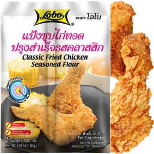Opis: Mieszanka mąk do smażonego kurczaka jak z KFC w opakowaniu 150g firmy Lobo. To mieszanka mąk i marynaty używana w kuchni orientalnej do panierowania każdego rodzaju mięsa, ryb oraz krewetek. Panierowane potrawy są bardzo smaczne oraz chrupiące. Mąka z dodatkiem marynaty, daje efekt bardzo podobny do kurczaka z KFC. Produkt zawiera w saszetki, jedna z przyprawami marynaty, druga z mieszanką mąk.
