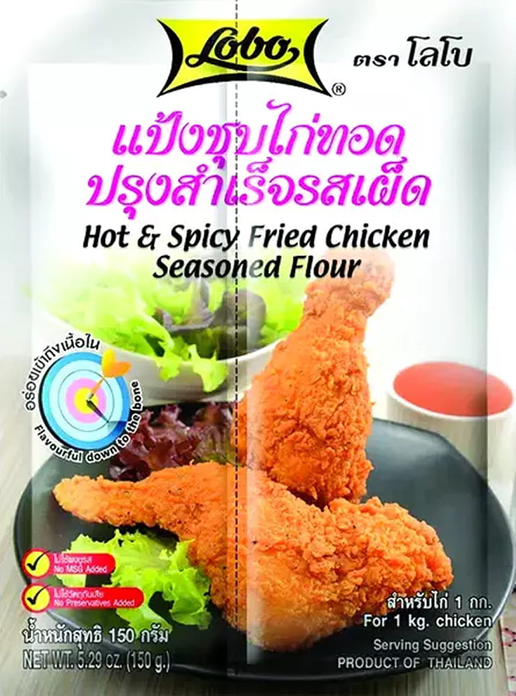Opis: Mieszanka mąk do smażonego kurczaka na ostro jak z KFC w opakowaniu 150g firmy Lobo. To mieszanka mąk i marynaty używana w kuchni orientalnej do panierowania każdego rodzaju mięsa, ryb oraz krewetek. Panierowane potrawy są bardzo smaczne oraz chrupiące. Mąka z dodatkiem marynaty na ostro, daje efekt bardzo podobny do kurczaka z KFC. Produkt zawiera w saszetki, jedna z przyprawami marynaty, druga z mieszanką mąk.