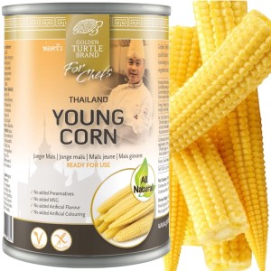 Opis: Mini kolby kukurydzy w puszce o pojemności 425g wyprodukowana przez firmęt Golden Turtle Brand. Mini kukurydza to identycznie ta sama kukurydza, co spotykana w Polsce, jednak zbierana w odpowiednim momencie przed wzrostem. Często używana w kuchni azjatyckiej jako dodatek warzywny do dań smażonych, zup, czy sałatek. Prezentowany produkt pochodzi z Tajlandii.