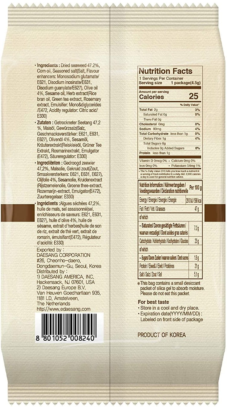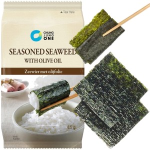 Opis: Nori snack to bardzo dobra i bogata w jod przekąska z wodorostów w opakowaniu 4,5g z dodatkiem oliwy z oliwek firmy Chung Jung One. Uprażone wodorosty posiadają bardzo dużo składników odżywczych oraz witamin. Te małe liście nori są niezastąpione w koreańskich potrawach i są spożywane na wiele różnych sposobów: z ryżem lub warzywami, w sałatkach, z mięsem oraz jako przekąska. Po prostu pyszne do wszystkiego.