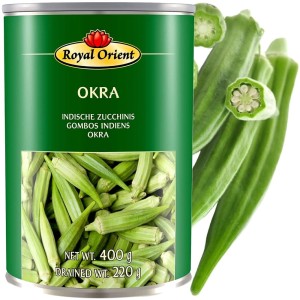 Opis: Okra w puszce o pojemności 400g firmy Royal Orient. Popularne warzywo jednoroczne, często stosowane w kuchni azjatyckiej. Podobna kształtem do fasoli szparagowej oraz papryczek chili. Do gotowania stosuje się najczęściej niedojrzałych. W smaku podobna jest do bakłażana oraz fasolki szparagowej. W kuchni japońskiej z okry można przygotować smaczną tempurę, smażoną na głębokim tłuszczu.