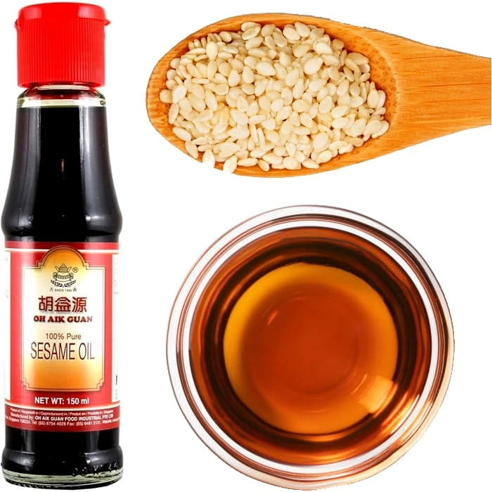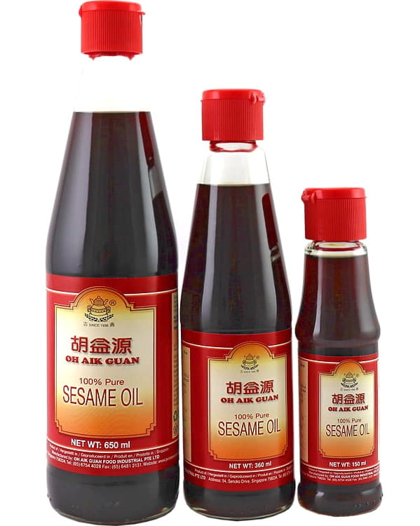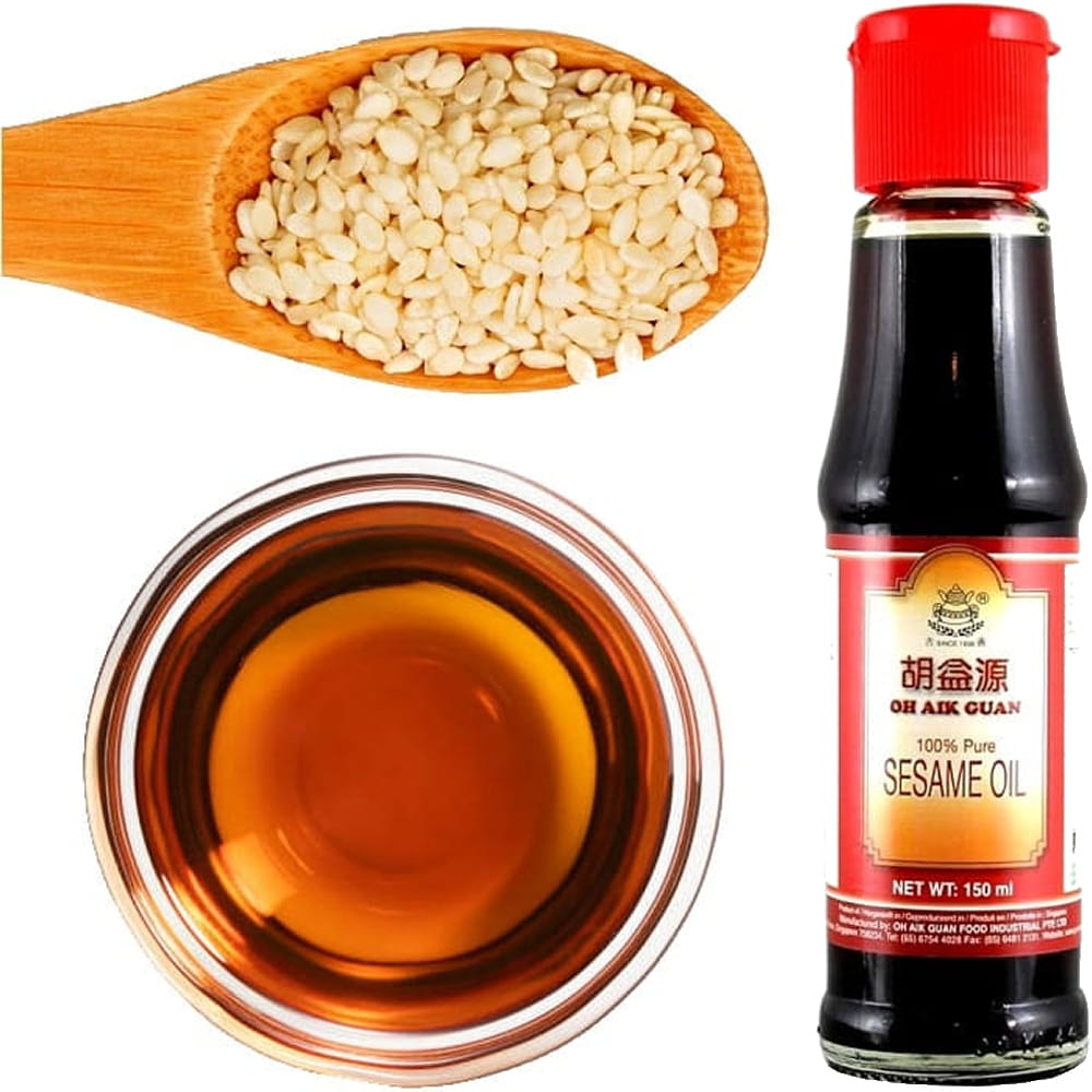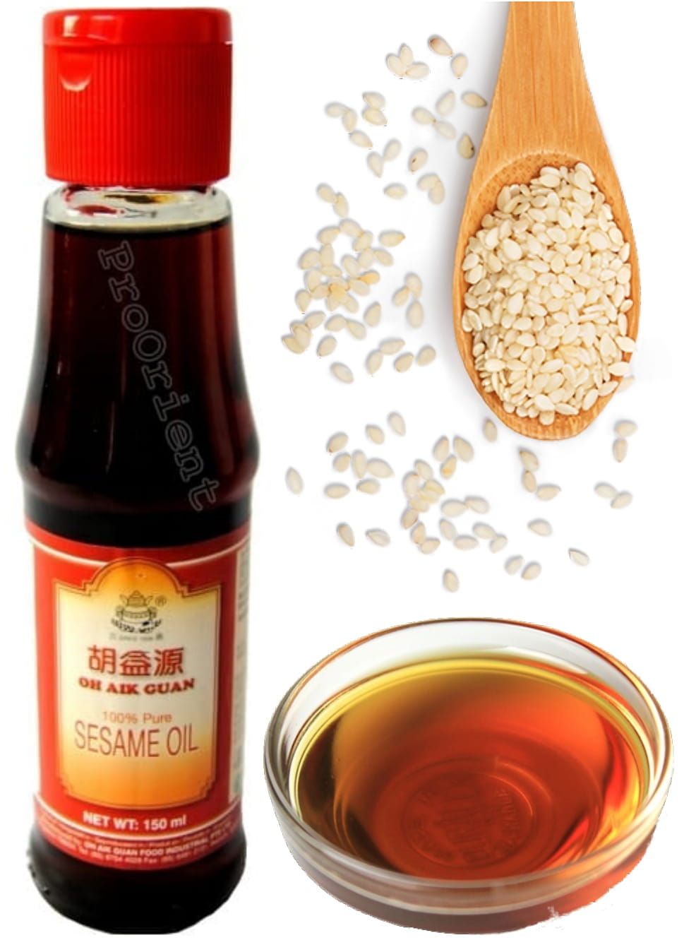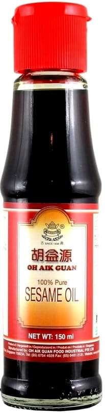 Opis: Olej sezamowy z prażonych ziaren sezamu w buteleczce o o pojemności 150ml singapurskiej produkcji przez firmę Oh Aik Guan. Orientalny olej wykorzystywany w kuchni azjatyckiej na wiele różnych sposobów, głównie jako przyprawa. Na oleju sezamowym nie należy smażyć, ponieważ służy on jako dodatek smakowy do gotowania, polewania sałatki, marynat oraz sosów.