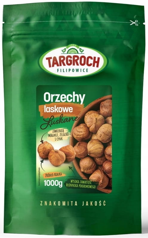 Opis: Orzechy laskowe łuskane w szczelnie zamykanym opakowaniu o pojemności 1kg firmy Targroch. Zawierają bardzo cenne witaminy E, B1, B2, PP oraz C. Są również źródłem wielu minerałów takich jak cynk, potas, miedź oraz żelazo. Bardzo często stosowane do wyrabiania mleczka orzechowego oraz domowej czekolady. Idealnie nadają się do dań, deserów, sałatek, sosów, wyroInformacje dodatkowe: Ze względu na konfekcjonowanie przez firmę Tar-Groch-Fil rozmaitych produktów na terenie jednego zakładu produkt może zawierać śladowe ilości: sezamu, migdałów, glutenu, dwutlenku siarki, różnych orzechów.