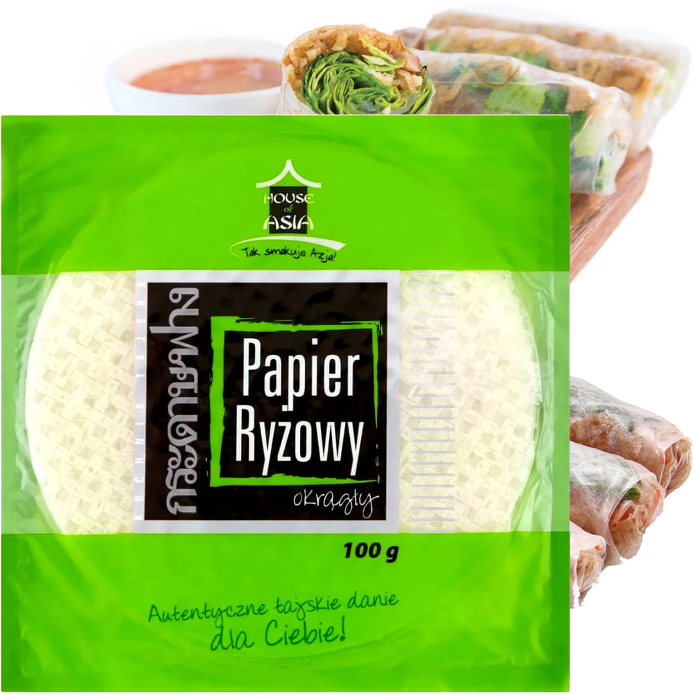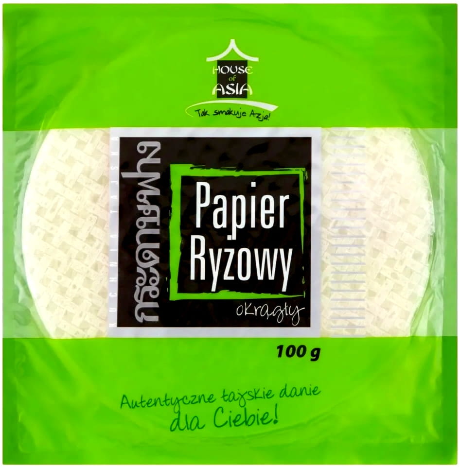 Opis: Papier ryżowy o średnicy 22cm w opakowaniu 100g firmy House of Asia. Niezbędny składnik wielu potraw kuchni azjatyckiej, szczególnie chińskiej, tajskiej i wietnamskiej. Sporządzony z mąki ryżowej, wody i soli, jest naturalny i pożywny. To cieniutkie, delikatne ciasto służy przede wszystkim do przygotowania popularnych sajgonek i spring rolls. Ale w papier ryżowy można zawinąć dosłownie wszystko. Jest gotowy do użycia po lekkim zwilżeniu wodą, pod której wpływem staje się elastyczny. Równie doskonale sprawdza się podczas smażenia.