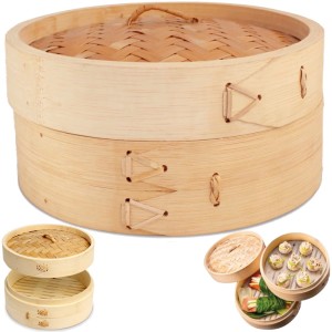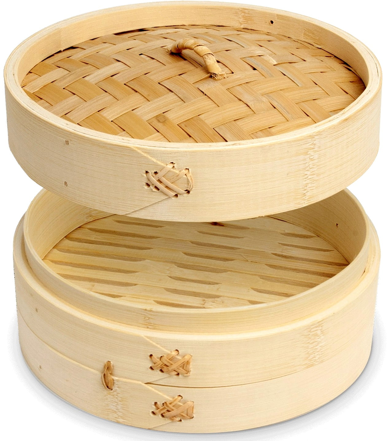 Opis: Okrągły parownik bambusowy o średnicy 20cm wykonany z dobrej jakości grubego bambusa. Parowar bambusowy składa się z 2 części: poziomu do gotowania na parze oraz pokrywki.