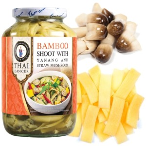 Opis: Pędy bambusa z grzybami słomianymi i yanang w słoiku o pojemności 680g znanej tajskiej firmy Thai Dancer. Idealne do smażenia na woku oraz dodatek do potrawy w formie sałatki. Najwyższa jakość i smak.