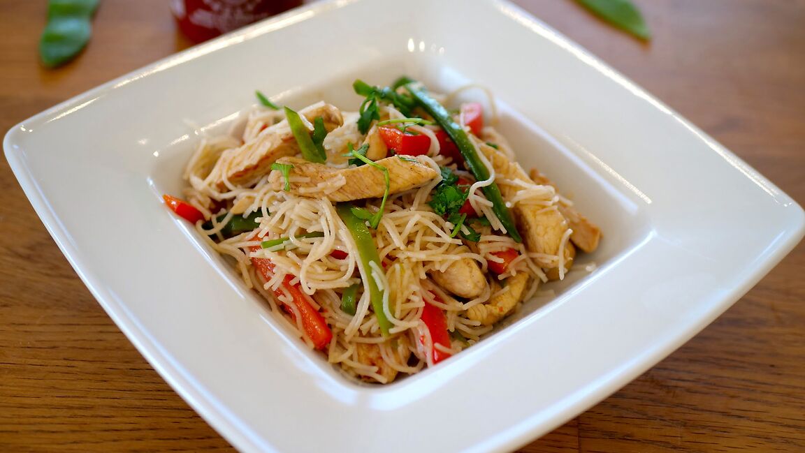 Makaron Ryżowy z Kurczakiem i Groszkiem Cukrowym