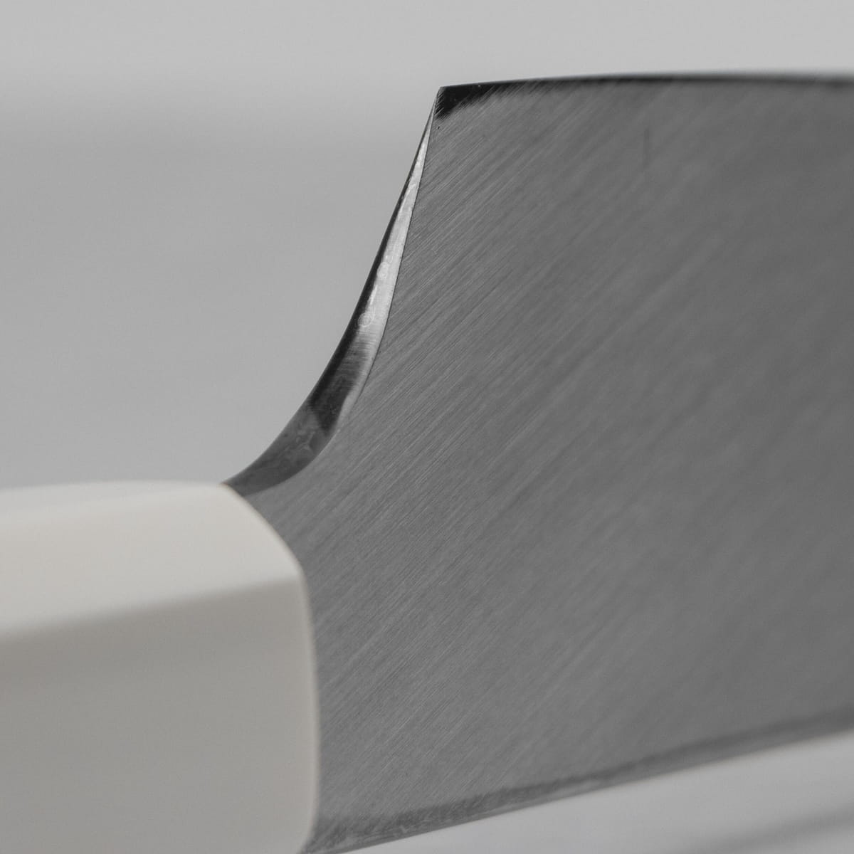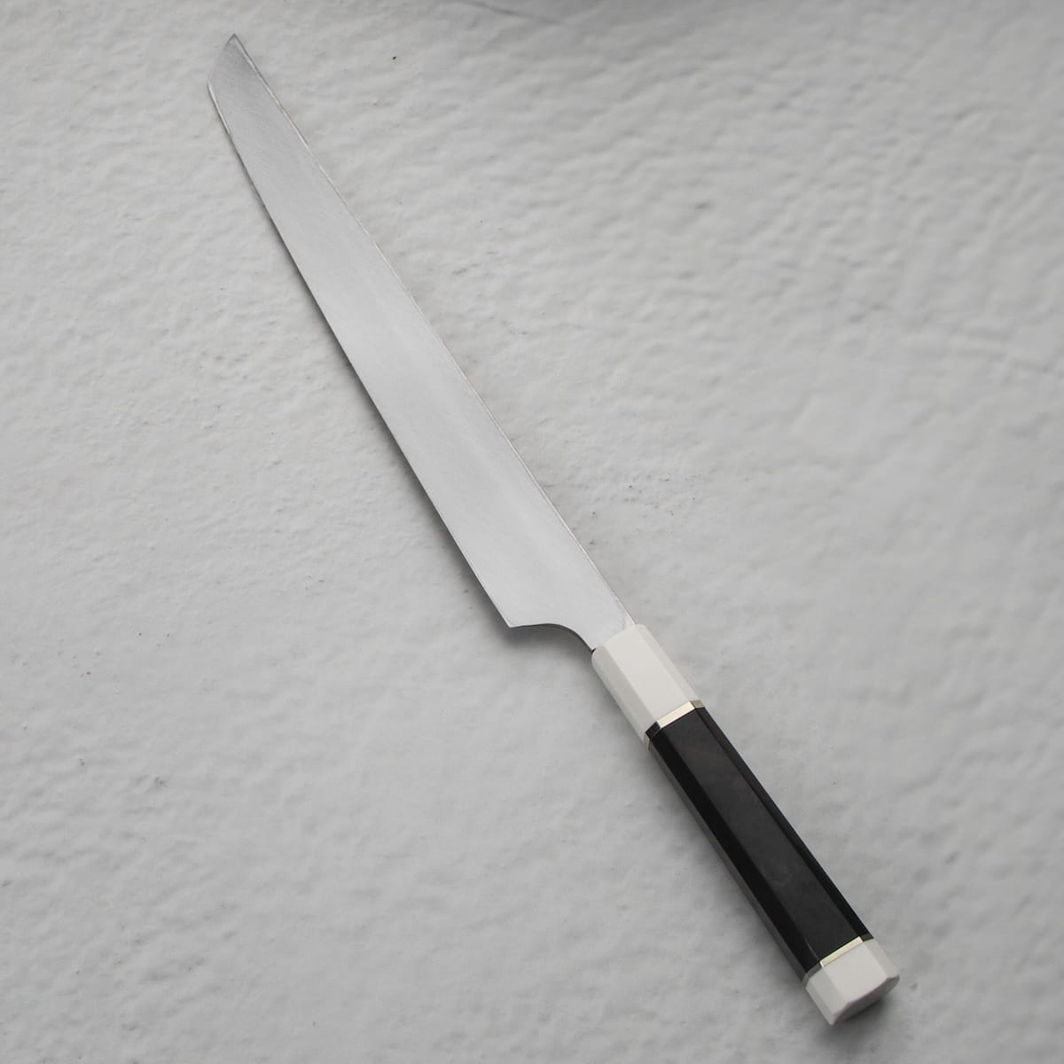Opis: Nóż Sakimaru to tradycyjny japoński nóż kuchenny o ostrzu w kształcie skrzydła. Jego nazwa pochodzi od słowa "saki", które oznacza szpic, i "maru", co oznacza okrągły. Ostrze jest szerokie u podstawy i stopniowo zwęża się do końca, tworząc szpiczaste zakończenie. Ten nóż jest zwykle używany do krojenia mięsa i ryb oraz do wykonywania precyzyjnych cięć, a jego długi i zwężający się kształt umożliwia łatwe i płynne cięcie przez składniki.