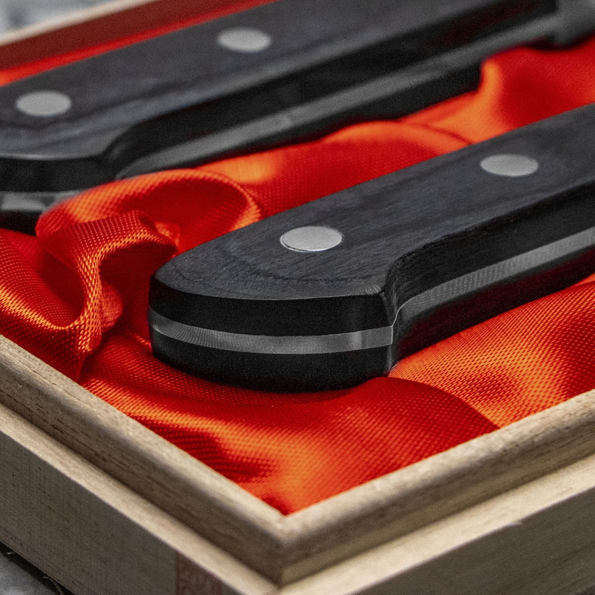 Opis: Zestaw 2 noży kuchennych zapakowany w tradycyjne drewniane opakowanie idealnie nadaję się na prezent dla każdego miłośnika gotowania. Noże wykonane z 69-warstwowej stali z rdzeniem MVS10Cob hartowanym do twardości 60 HRC, są idealne do środowiska domowego. skład zestawu wchodzi nóż Szefa kuchni o długości 20 cm, który z łatwością spełni każde zadanie w kuchni, oraz Nóż Santoku kuchni o długości 18 cm, przeznaczony do krojenia warzyw, owoców, mięsa i ryb.