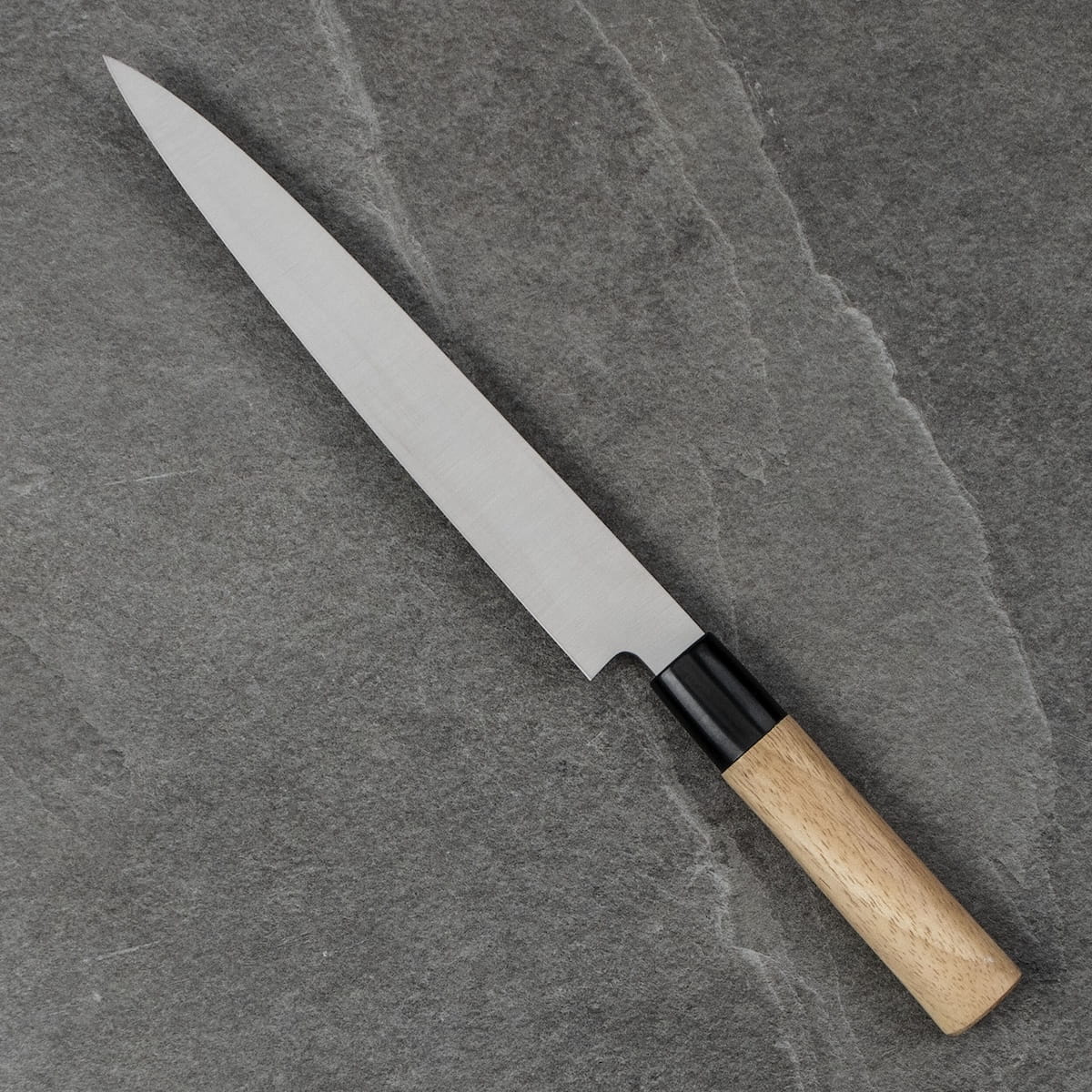 Opis: Nóż do sashimi (Yanagi) to tradycyjny japoński nóż, który służy do krojenia świeżych filetów na niemal przezroczyste plastry. Znakomicie się sprawdza podczas przygotowywania sushi, rybnego carpaccio oraz innych potraw z bardzo delikatnych składników. Długie, wąskie i sztywne ostrze zapewnia drobiazgową precyzję, a jednostronny szlif – czyste cięcie. Nożem Yanagi najlepiej wykonywać jednostajny ruch w jednym kierunku: do siebie.