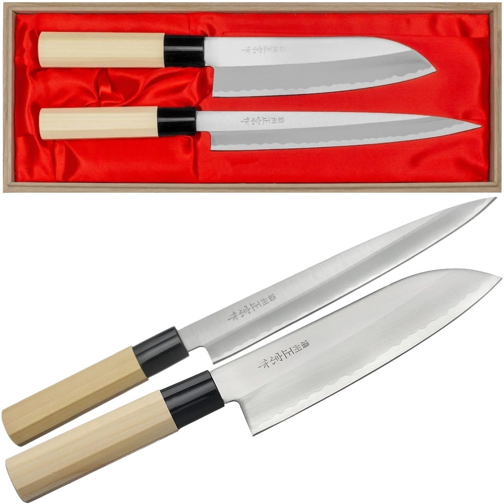 Satake Yoshimitsu Japoński Zestaw 2 Noży Santoku 17cm i Yanagi-Sashimi 21cm w Drewnianym Etui