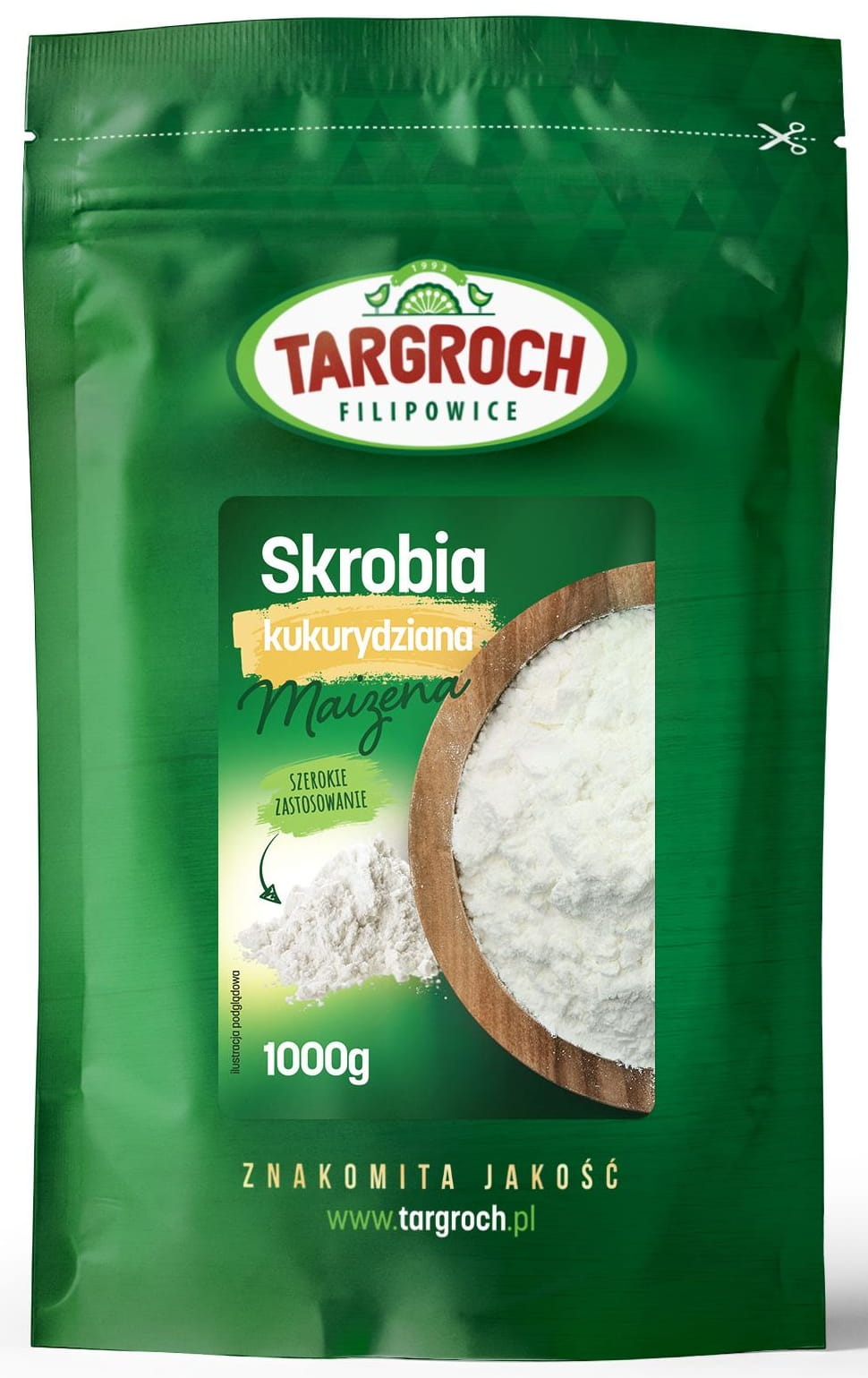 Opis: Skrobia kukurydziana w opakowaniu 1kg firmy Targroch. Powstaje z białych pręcików kukurydzy. Bezglutenowa, podobnie jak w przypadku mąka ryżowa. Używana do zagęszczania potraw i sosów, składnik mieszanek mąk do panierowania. Skrobia kukurydziana wykorzystywana jest również do wypieków różnego rodzaju ciast, ciasteczek, biszkoptów, naleśników.