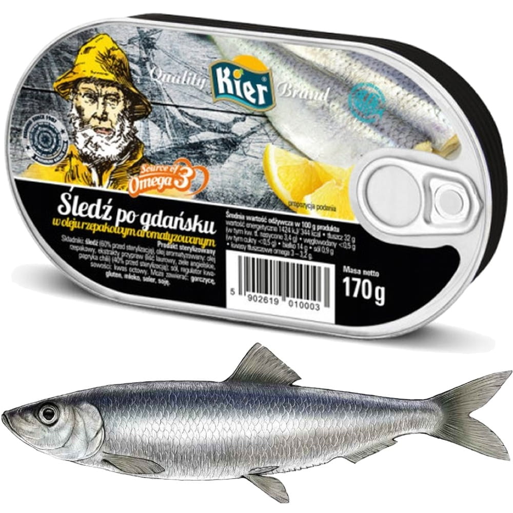 Opis: Śledź po gdańsku w oleju rzepakowym aromatyzowanym w opakowaniu o pojemności 170g, wyprodukowane przez firmę Kier.